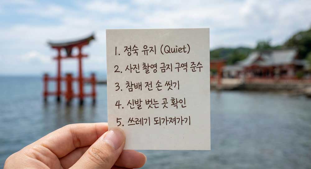 일반적으로 신사에서는 큰 소리, 금지 구역 진입, 구조물에 기대기 같은 행동을 피하는 게 좋다고 알려져 있어요. 방문객이 몰리는 시간대엔 줄이 생길 수 있으니, “사진 10분, 주변 정리해서 감상 10분”처럼 스스로 시간을 정해두면 밀리지 않습니다. 비가 오면 바닥이 미끄러울 수 있어 신발 밑창이 너무 매끈한 건 피하는 게 안전해요.